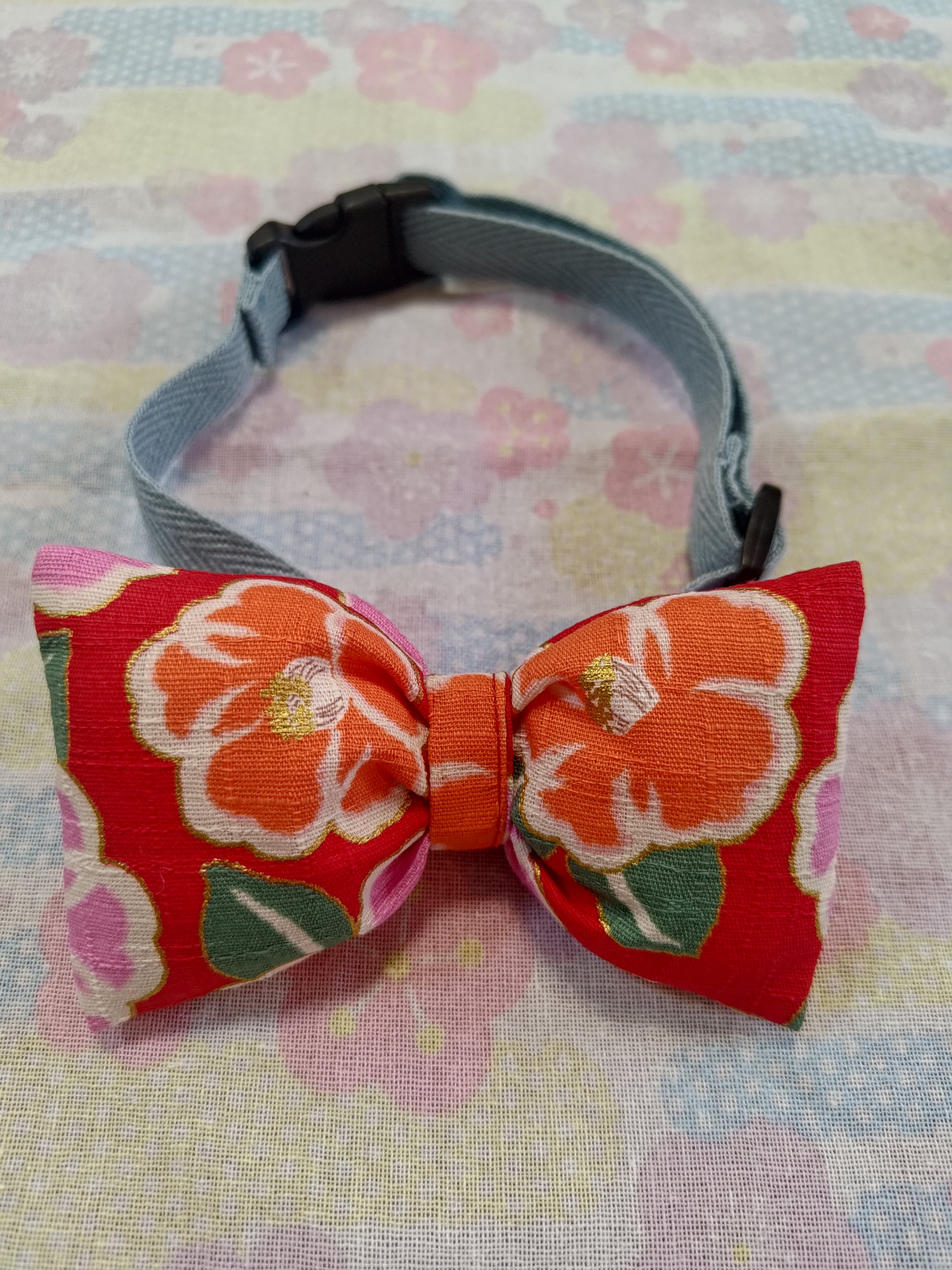 中型犬用蝶ネクタイ 赤ツバキ金彩和柄①