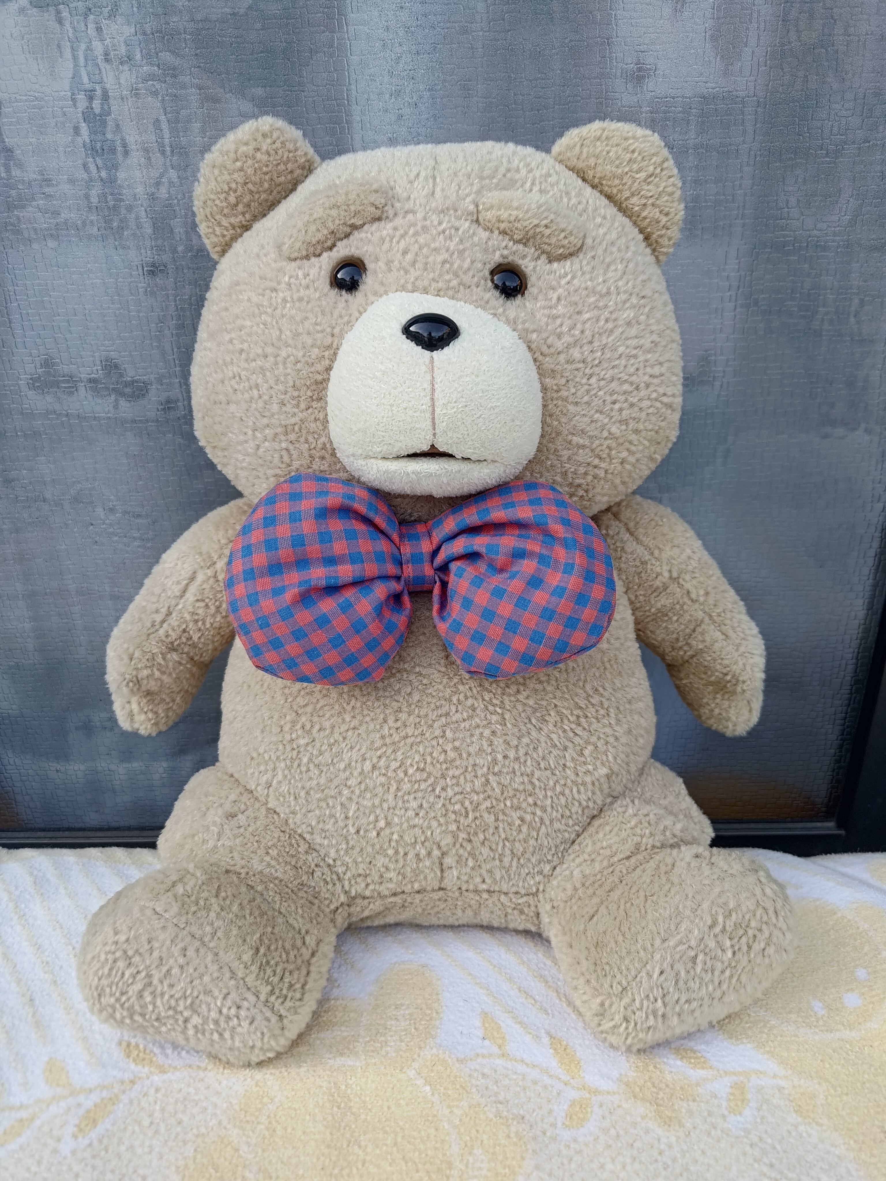 試しにテッドが付けると写真のようになりますのであなたのお家の可愛い子ちゃんとのサイズ感を目安にしていただければ幸いです。